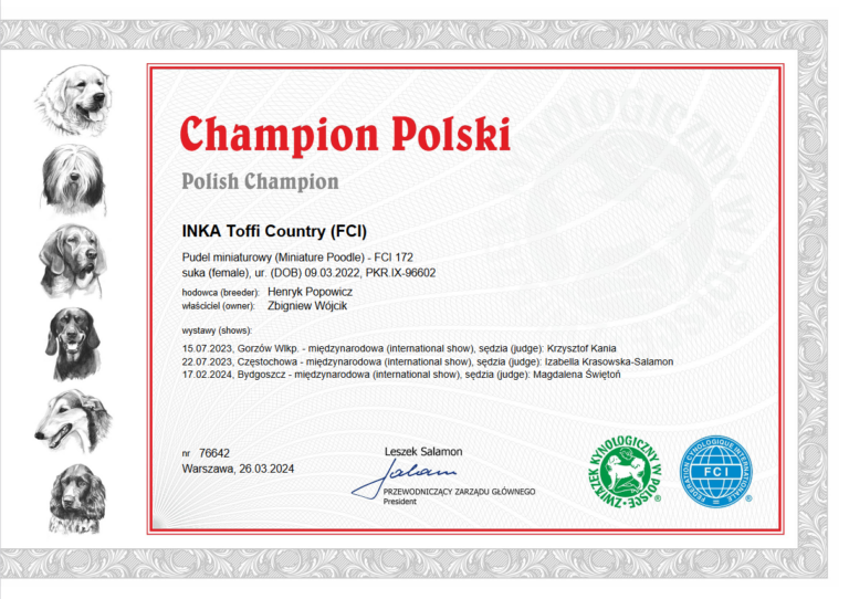 Certyfikat FCI 🐾Certyfikat Chamionatu Polski🐾 Chwalimy się! Niezmiernie jest nam