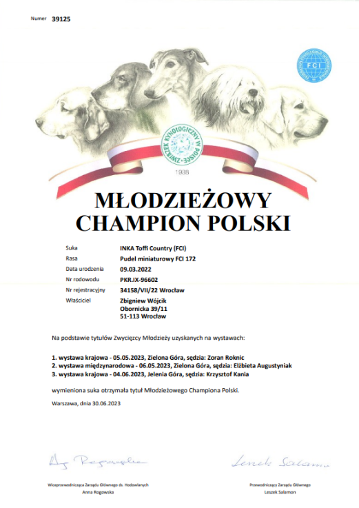Nasza kochana Inka Toffi Country FCI Pudel Miniaturowy Płowy otrzymała certyfikat,Mamy to.Inka Już jest Championem Polski. Dumni i super zadowoleni. ![]()